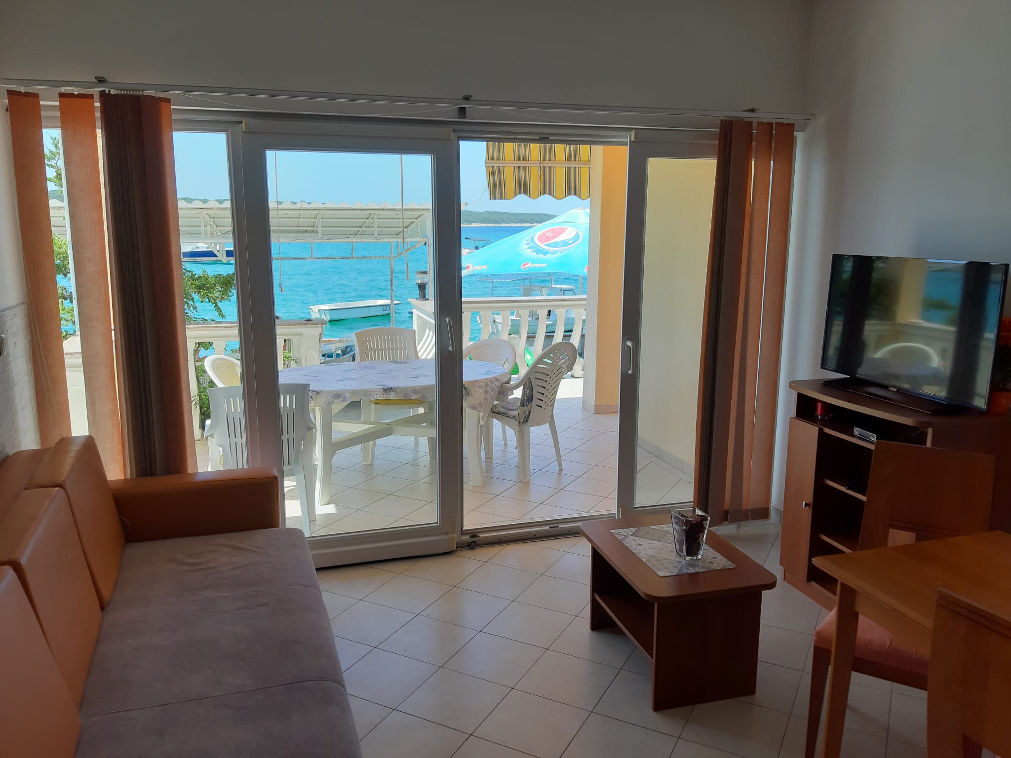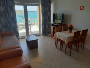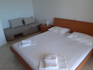Apartment 1A is a one-bedroom apartment with a capacity for 2+2 people, ideal for couples or smaller groups seeking a more intimate setting. – Kitchen with dinningroom and livingroom, – Bedroom, – Showerroom, – Large Terasse – TV – SAT